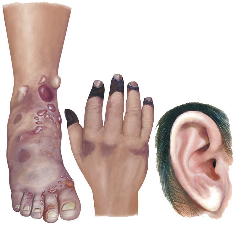 Frostbite เกิดจากการสัมผัสกับความเย็นจัดเป็นเวลานาน ทำให้เลือดไปเลี้ยงเนื้อเยื่อลดลงและเซลล์ถูกทำลาย ปัจจัยเสี่ยงได้แก่: