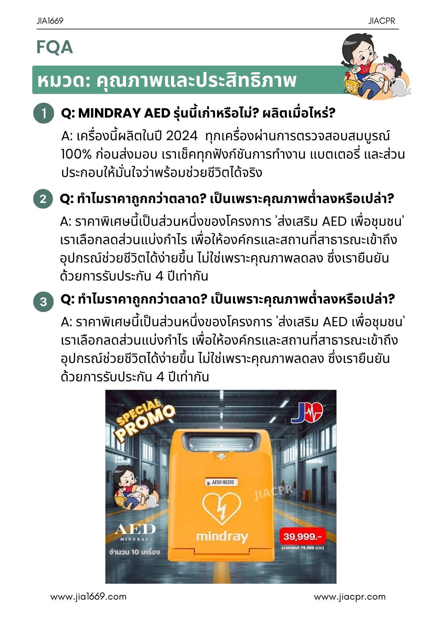 A: ราคาพิเศษนี้เป็นส่วนหนึ่งของโครงการ “ส่งเสริม AED เพื่อชุมชน” โดยบริษัทเลือกปรับลดส่วนแบ่งกำไร เพื่อให้องค์กรและสถานที่สาธารณะสามารถเข้าถึงอุปกรณ์ช่วยชีวิตได้ง่ายขึ้น ไม่ได้เกิดจากการลดคุณภาพแต่อย่างใด ทั้งนี้ยังคงได้รับการรับประกัน 4 ปี ตามมาตรฐานเดียวกับการจำหน่ายปกติ